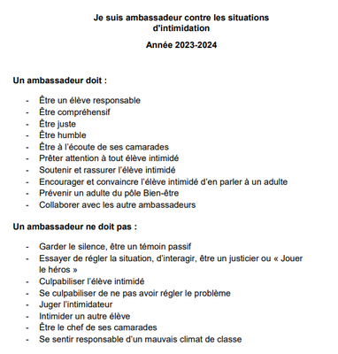 Durant la première réunion, les élèves ont rédigé une charte dans le but de fixer un cadre au rôle d’ambassadeur. En effet, celui-ci n’a pas pour rôle de régler tout seul les situations d’intimidation. Il est une sentinelle qui a pour mission de repérer une situation, soutenir le camarade intimidé et alerter un adulte.
