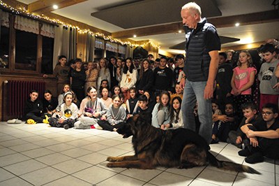 Enfin, les jeunes participaient à une veillée différente chaque soir : projection d’un film, jeux de société et intervention d’un pisteur secouriste-nivologue, Jacques, qui les a sensibilisés aux risques en montagne et leur a expliqué la formation des chiens d’avalanches. Et comme les élèves ont été très sages durant la projection de son diaporama, nous avons pu faire connaissance avec son chien Népal, un magnifique berger qui intervient régulièrement avec lui lors d’avalanches pour tenter de sauver des vies.